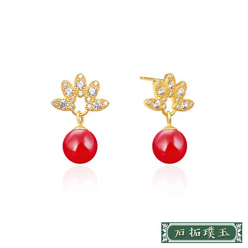 純銀925微鑲美鑽花型櫻桃珍珠造型耳環 *石拓璞玉* |