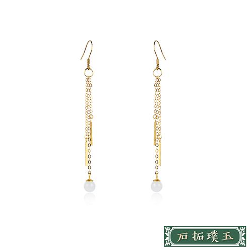 純銀925古法金長條線墜白玉珠造型耳環 *石拓璞玉* |