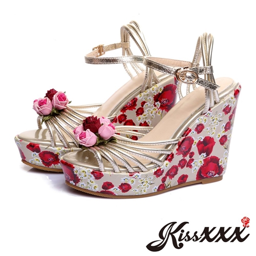 唯美玫瑰花朵細帶魚口露趾造型楔形涼鞋 淺金 |