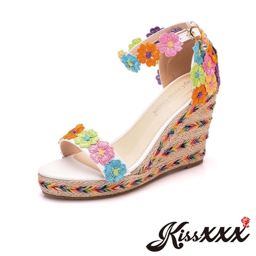 繽紛彩色花朵一字帶草編元素楔形坡跟繫帶涼鞋 彩色 |