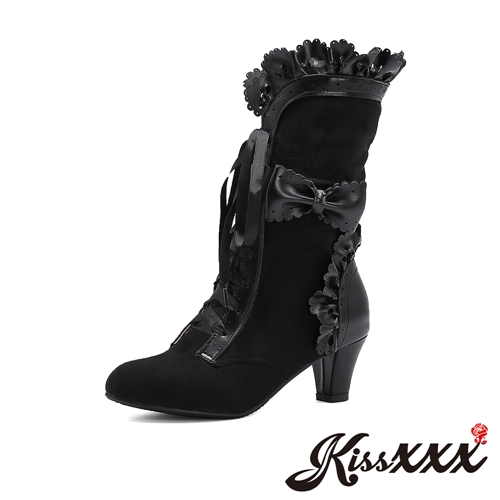 [快速出貨] 蘿莉塔蕾絲花邊蝴蝶結綁帶粗跟中筒靴 黑*KissXXX* |