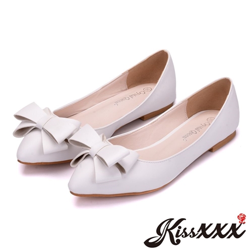 立體蝴蝶結飾漆皮尖頭低跟鞋 白 |