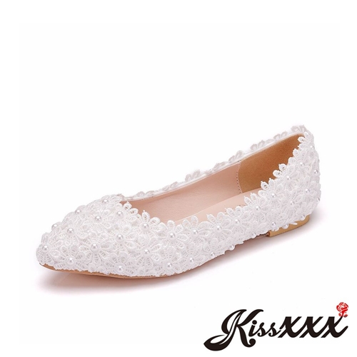 唯美珍珠蕾絲花朵尖頭低跟鞋 白 |