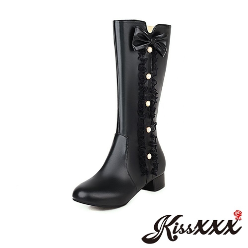 甜美公主風蕾絲花邊珍珠釦蝴蝶結造型低跟中筒靴 黑 |