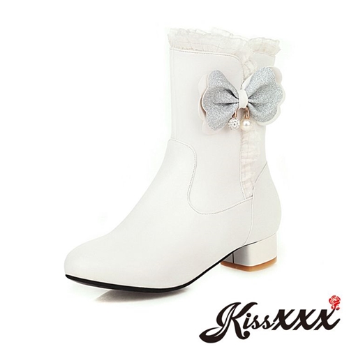 甜美公主風蕾絲花邊金蔥蝴蝶結造型低跟短靴 白 |