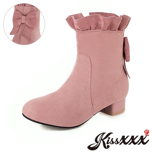 典雅絨面木耳花邊蝴蝶結造型低跟短靴 粉 |
