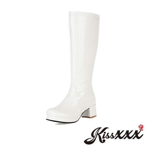 百搭亮漆皮防水台粗跟長筒靴 白 |