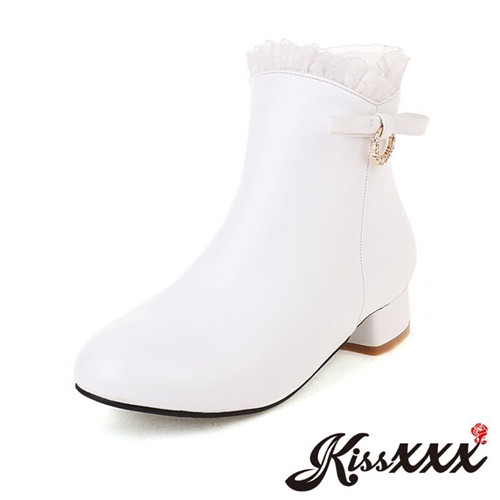 唯美蕾絲花邊靴口一字蝴蝶結造型粗跟短靴 白 |