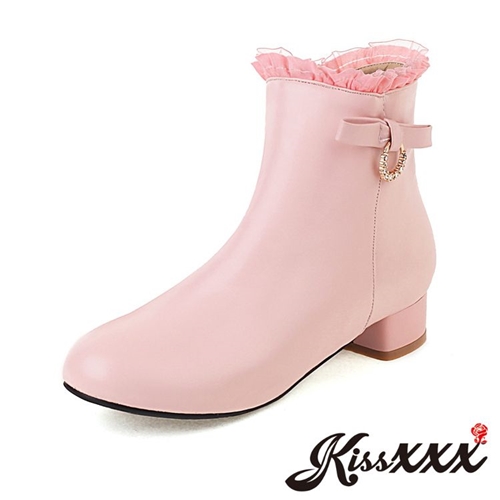 唯美蕾絲花邊靴口一字蝴蝶結造型粗跟短靴 粉 |
