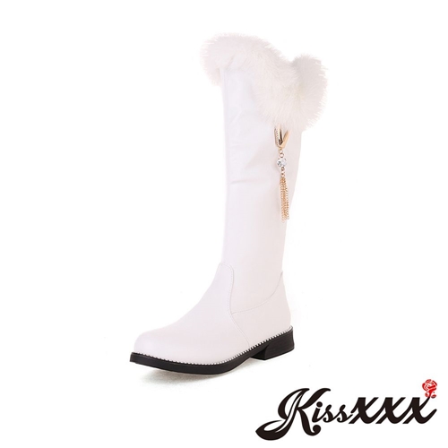 華麗絨毛靴口流蘇V釦造型低跟長靴 白 |