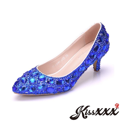 尖頭淺口不規則寶石貼鑽華麗高跟鞋 藍 |