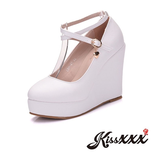 小圓頭淺口純色交叉繫帶防水台楔形鞋 白 |