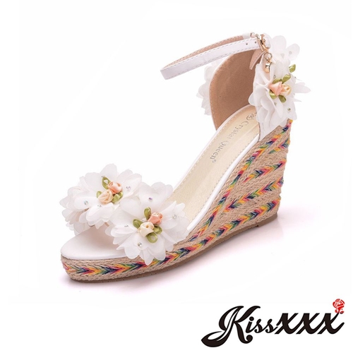 唯美貼鑽玫瑰白色紗花一字繫帶楔形涼鞋 白 |