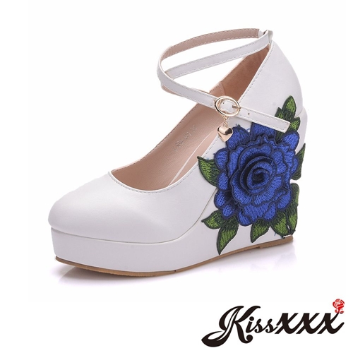 立體時尚花朵刺繡造型小圓頭交叉繫帶防水台復古楔形鞋 白 |