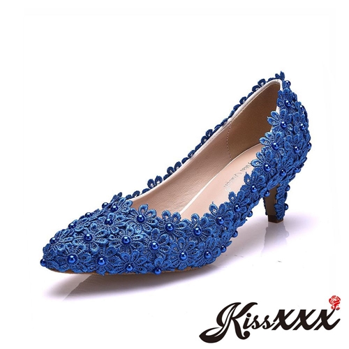 珍珠花朵刺繡唯美蕾絲尖頭淺口高跟鞋 藍 |