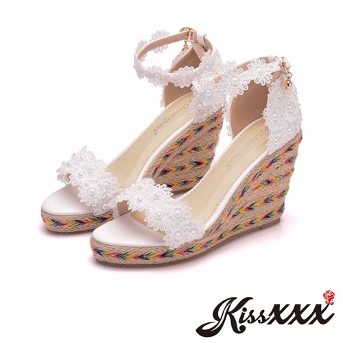 唯美珍珠蕾絲花朵一字繫帶防水台草編楔形涼鞋 白 |