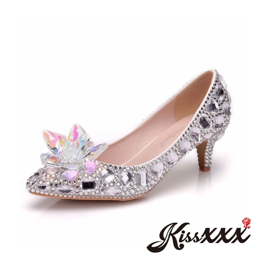 華麗水晶花璀璨寶石貼鑽尖頭高跟鞋 銀 |