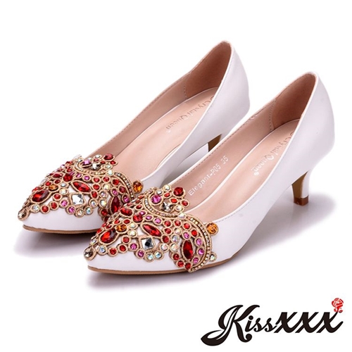 璀璨華麗彩色寶石鑲嵌民族風飾面尖頭高跟鞋 白 |