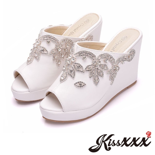 奢華宮廷風花形鑽飾魚口露趾楔形坡跟拖鞋 白 |