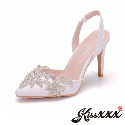 華麗宮廷風鑽飾尖頭時尚高跟拖鞋 白 |