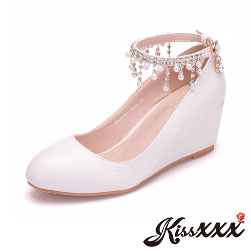 純色小圓頭珍珠流蘇繫帶楔形坡跟鞋 白 |