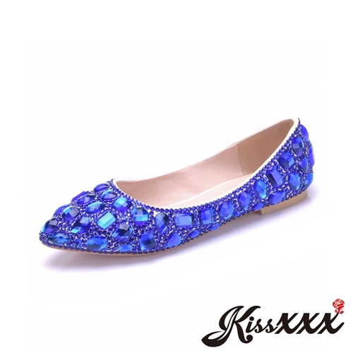 不規則寶石燙鑽尖頭華麗滿鑽低跟鞋 藍 |