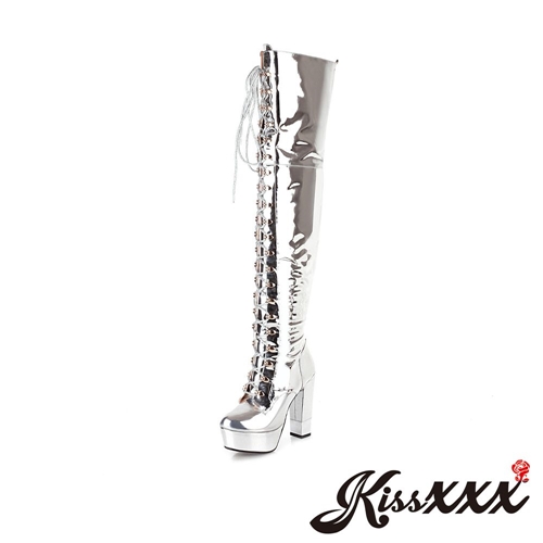 時尚復古性感綁帶防水台高跟過膝長靴 銀 |