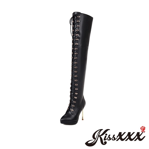 美腿效果尖頭細高跟復古綁帶性感過膝長靴 黑 |