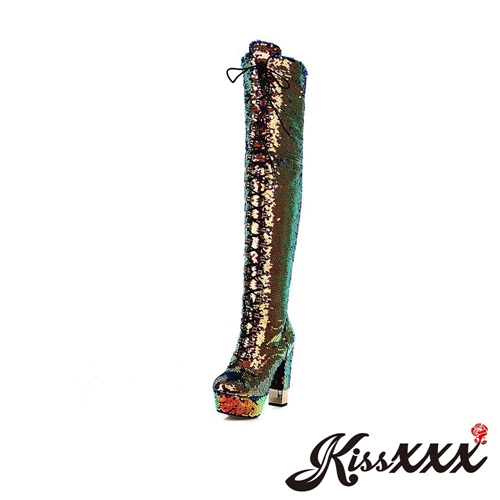 璀璨變色亮片防水台粗跟性感過膝長靴 金 |