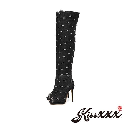 魚口露趾防水台破損風彈力牛仔高跟過膝長靴 黑 |
