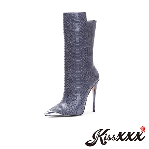 [訂製]時尚尖頭蛇紋金屬亮皮拼接高跟中筒靴 藍 |