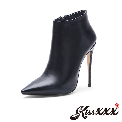 [訂製]純色質感皮紋尖頭細跟高跟短靴 黑 |