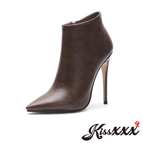 [訂製]純色質感皮紋尖頭細跟高跟短靴 咖 |