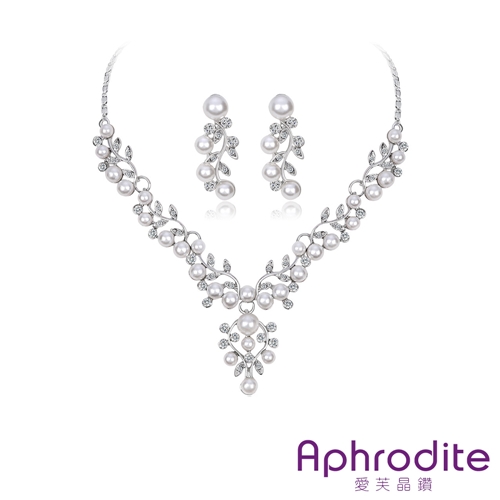 微鑲美鑽浪漫氣質珍珠縷空花葉項鍊耳環2件套組*愛芙晶鑽* |