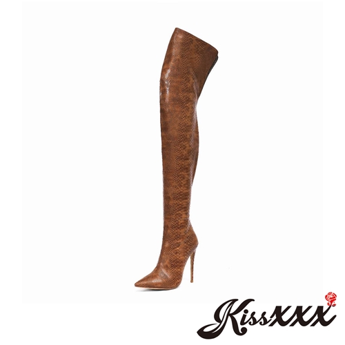 [訂製]狂野蛇紋復古純色尖頭高跟過膝長靴 棕 |