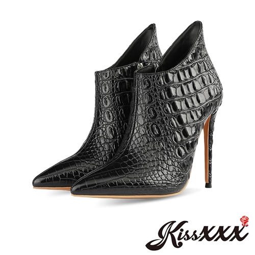 [訂製]時尚尖頭美腿效果設計款擦色立體鱷魚皮紋高跟踝靴 黑 |