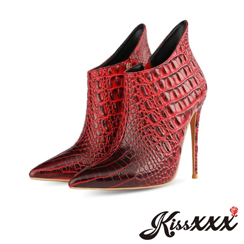 [訂製]時尚尖頭美腿效果設計款擦色立體鱷魚皮紋高跟踝靴 紅 |