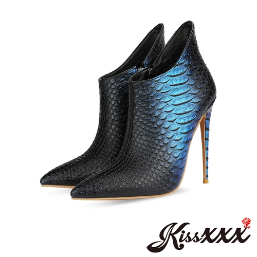 [訂製]時尚尖頭美腿效果設計款撞色鱷魚皮紋造型高跟踝靴 藍 |