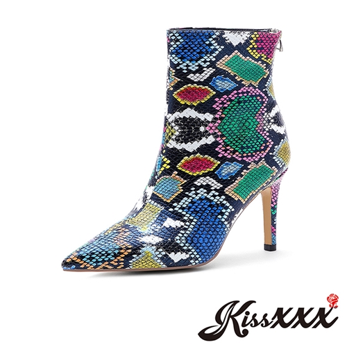 [訂製]個性尖頭野性蛇紋皮面造型高跟短靴 彩 |