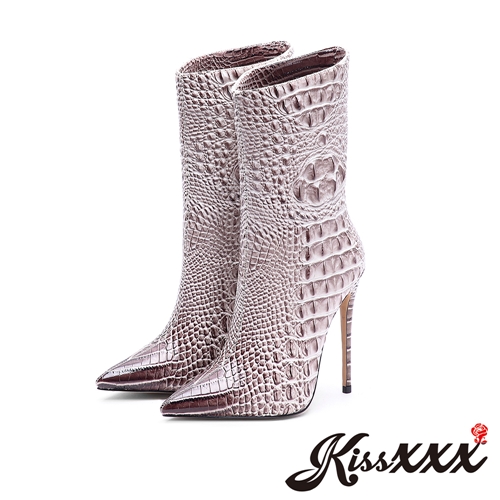 [訂製]時尚復古質感立體鱷魚皮紋高跟直筒短靴 米 |