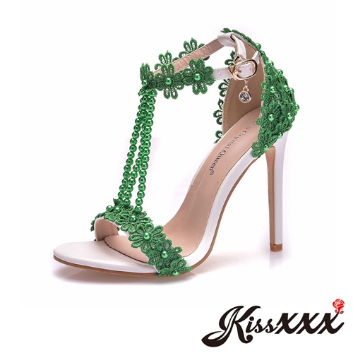 [訂製]唯美蕾絲珍珠鍊飾性感造型一字帶高跟涼鞋 綠 |