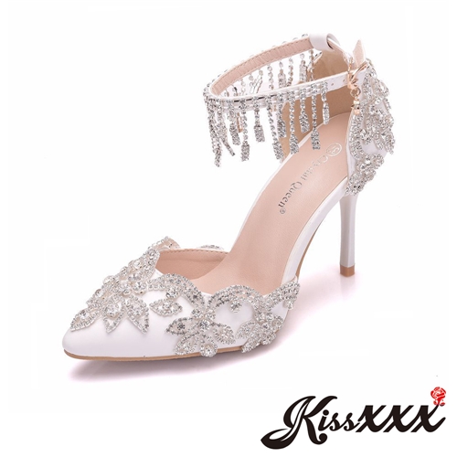 [訂製]璀璨宮廷風花形美鑽尖頭方晶鑽鍊流蘇繫帶高跟涼鞋 白 |