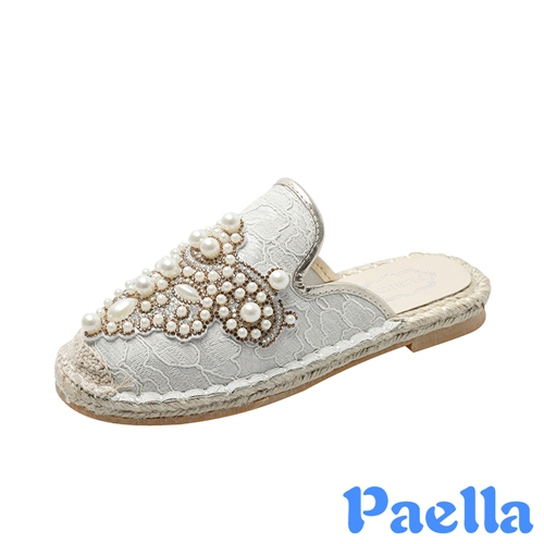 [快速出貨] 華麗美鑽珍珠蕾絲網紗草編拼接包頭拖鞋 白*Paella* |