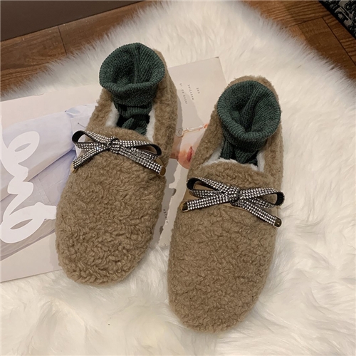 [快速出貨] 可愛毛絨燙鑽蝴蝶結造型平底樂福鞋 卡其*38.6°C* |