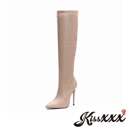 [訂製]質感瘋馬皮紋小寬筒尖頭性感高跟長靴 米 |