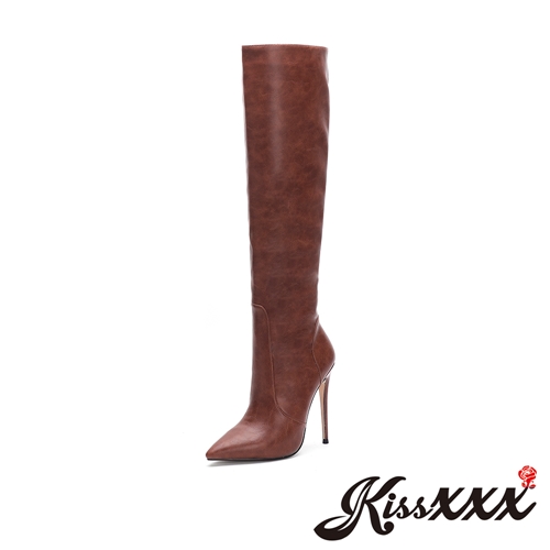 [訂製]質感瘋馬皮紋小寬筒尖頭性感高跟長靴 咖 |