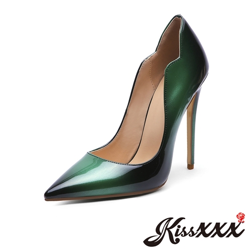 [訂製]尖頭淺口漸層漆皮不規則V口造型細跟時尚高跟鞋 綠 |