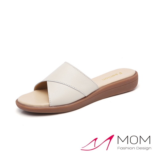 真皮V口交錯造型時尚舒適平底拖鞋 米 |
