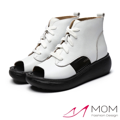 真皮時尚繫帶鬆糕厚底百搭縷空涼靴 白 |
