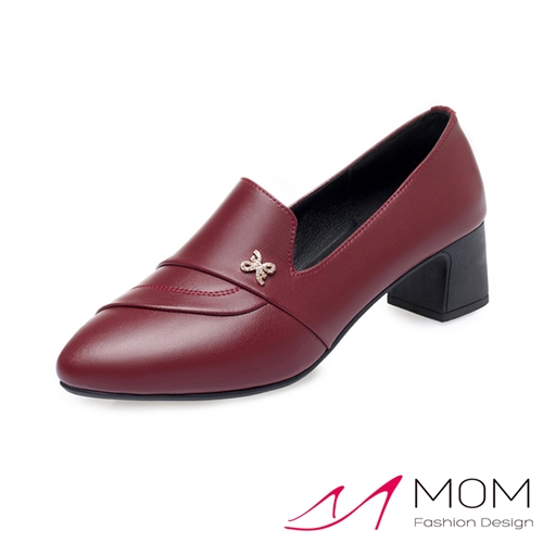 真皮頭層牛皮尖頭拼接墜美鑽低跟便鞋 酒紅 |